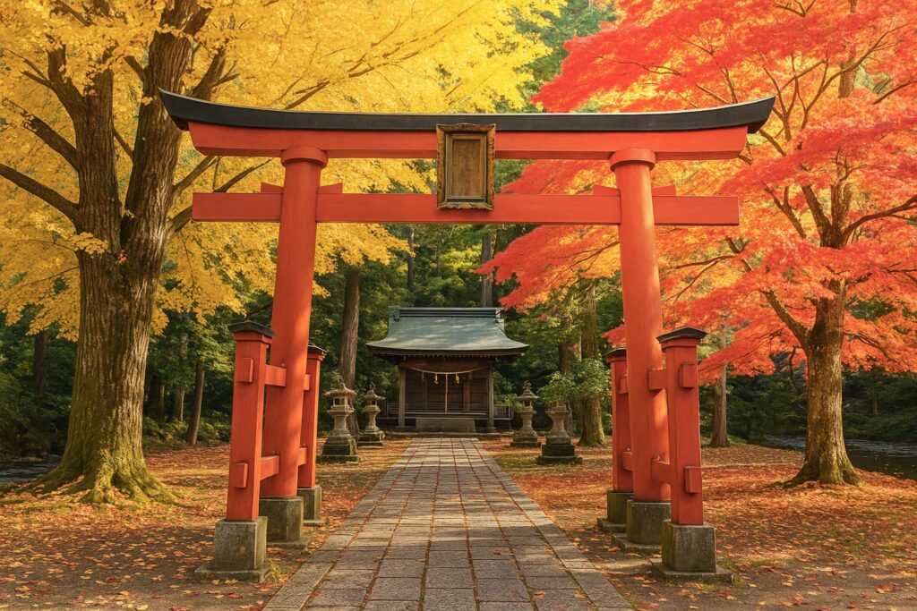 続いて、湖畔へ。鏡のように紅葉を映す水面は、朝夕で表情を変え、静寂の中で息を呑む絶景を堪能できます。さらに、歴史ある「八幡神社」の境内も見逃せません。古木に囲まれた参道は、朱色の鳥居と紅葉のコントラストが印象的です。